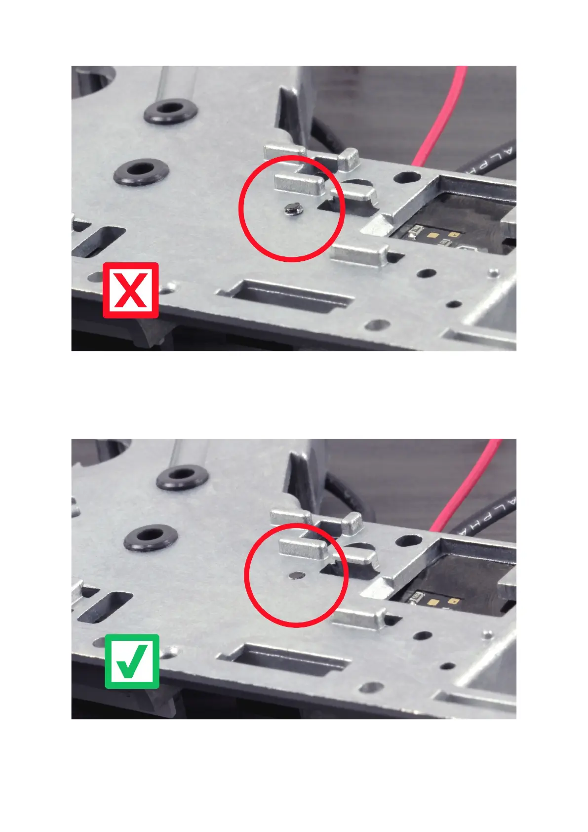 between the screw and the insulation washer. It cannot touch the circuit board directly.