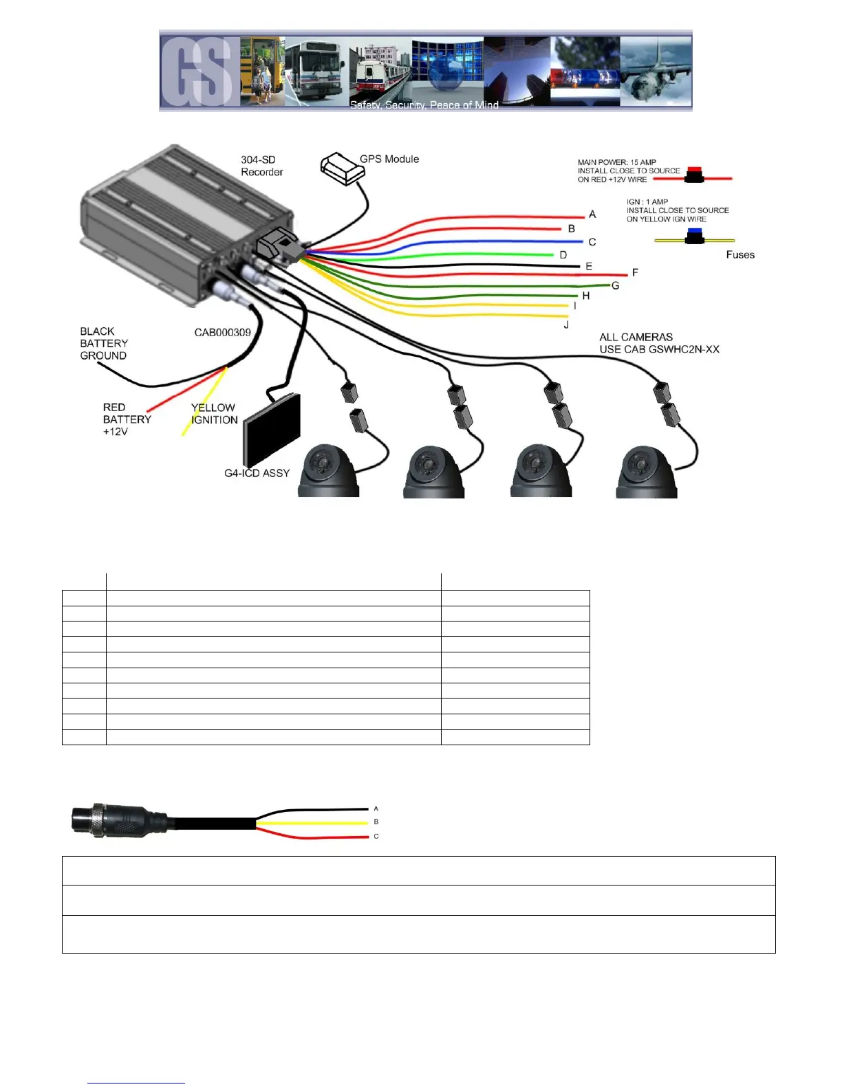 Ignition (B) (Yellow): Connect to vehicle ignition. +12V signal required to activate the 304SD. Ensure that the provided 1