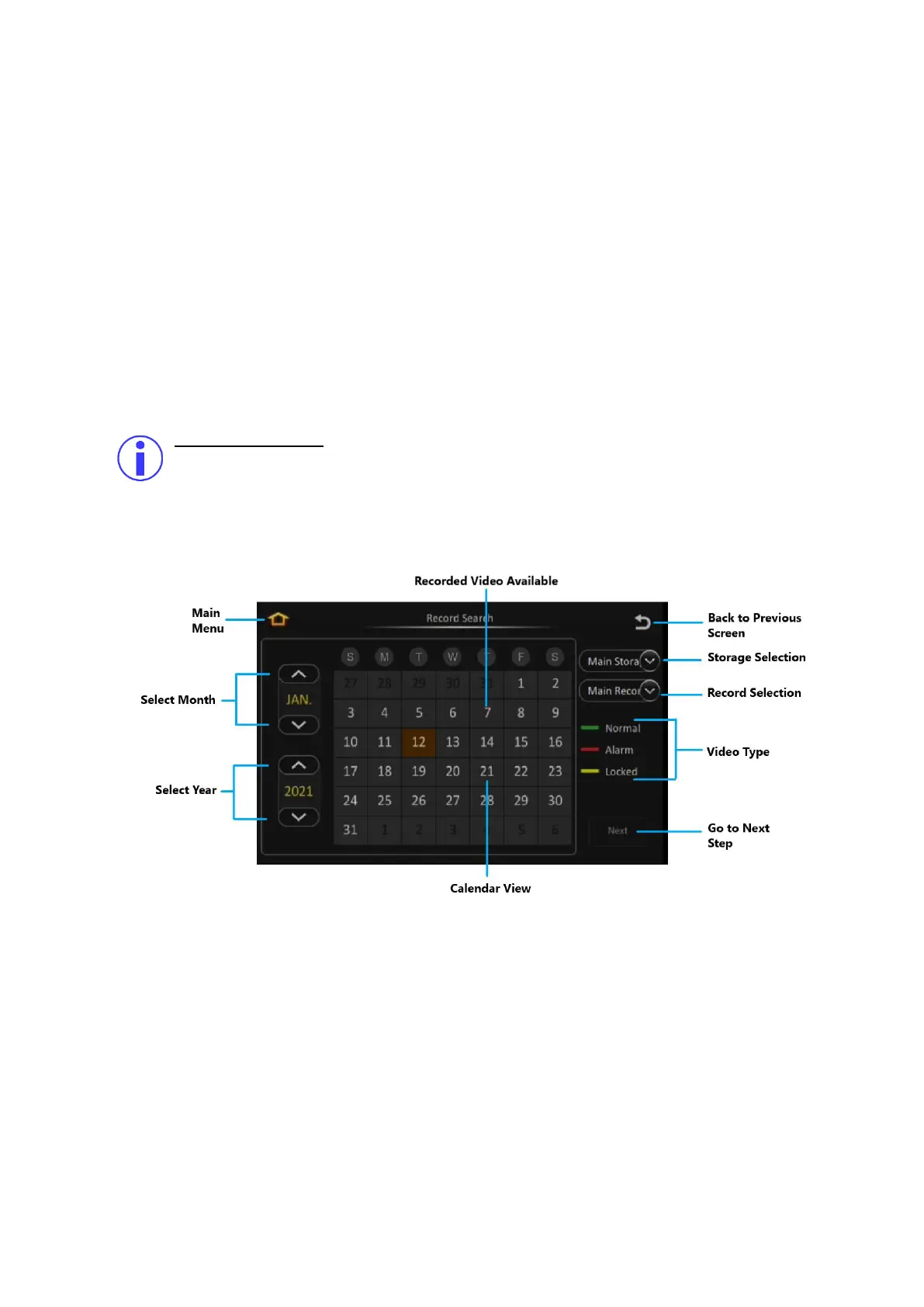 ▪ Recorded Video Available: A colored bar below the date indicates that recorded video exists for