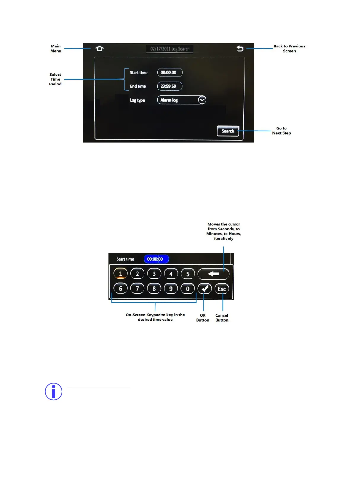 screen keypad which allows you to key in a specific time (in hh:mm:ss 24-hour time format).