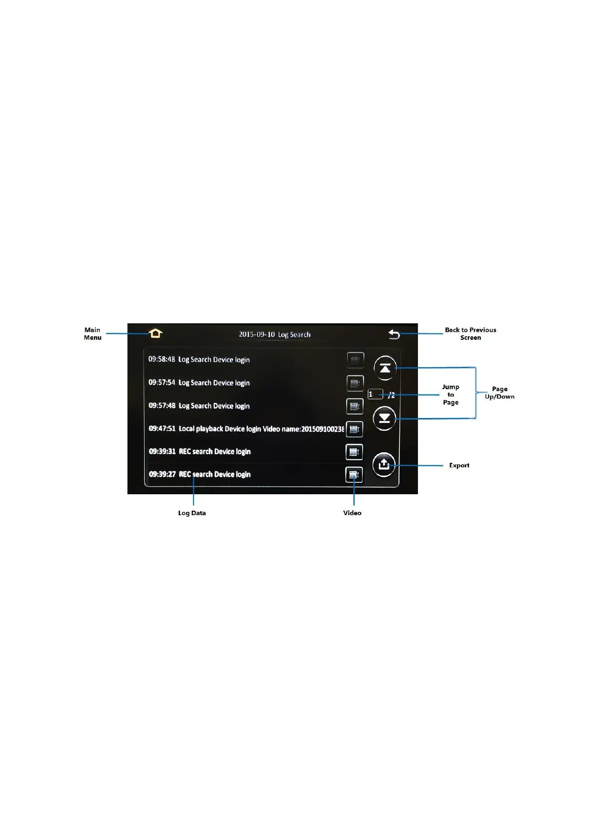 ▪ Export: Clicking this icon allows you to export the log file to an external storage USB flash drive.