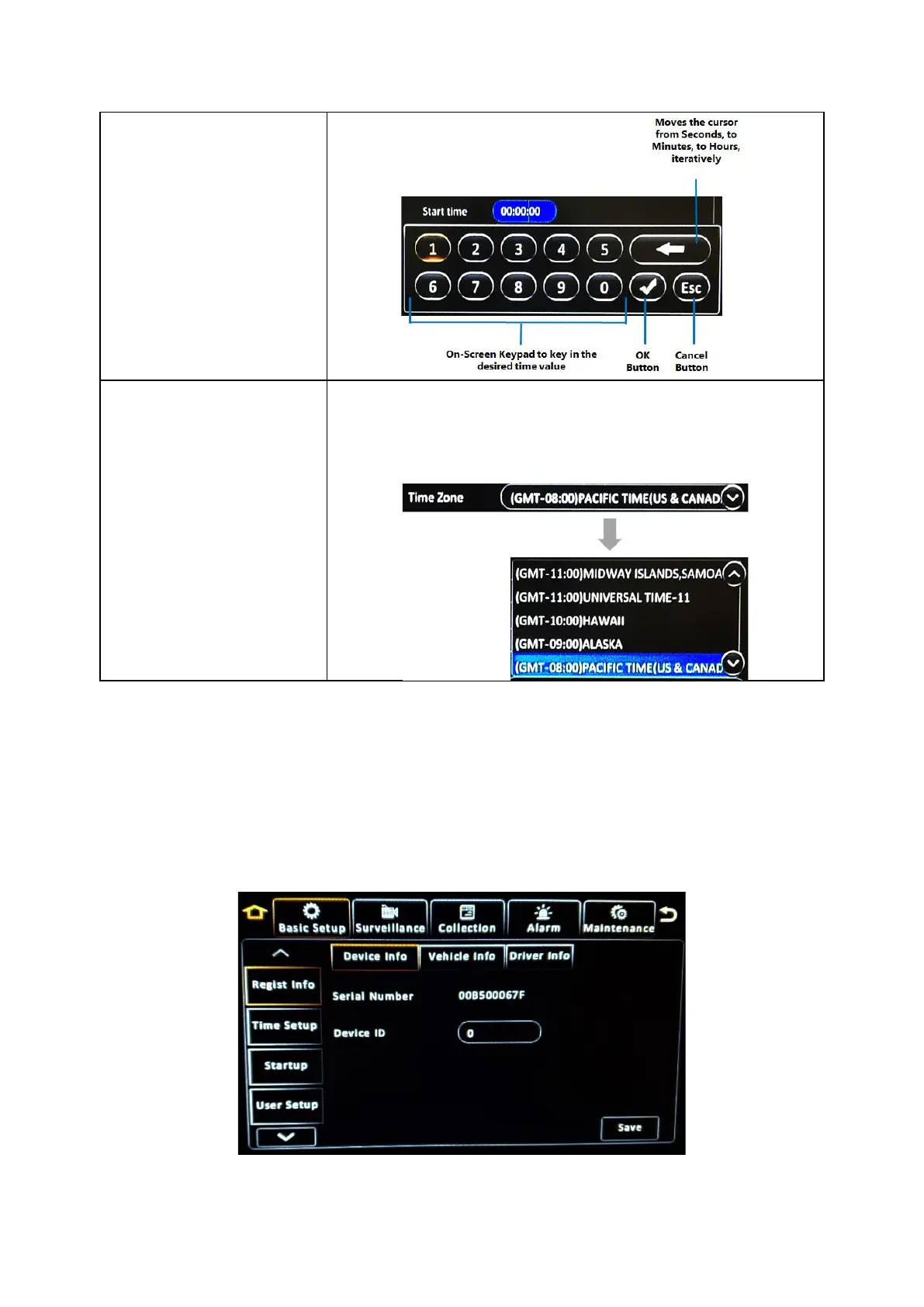 configurations such as device identifiers and vehicle information, user management, time setup, device