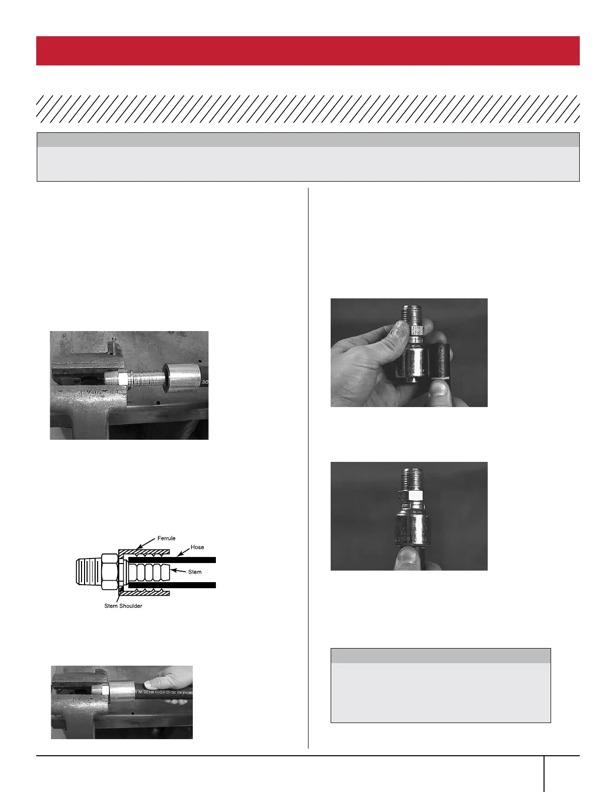 A new hose and end fittings (stem/ferrule) must be used when building a hose assembly. Re-using any component will