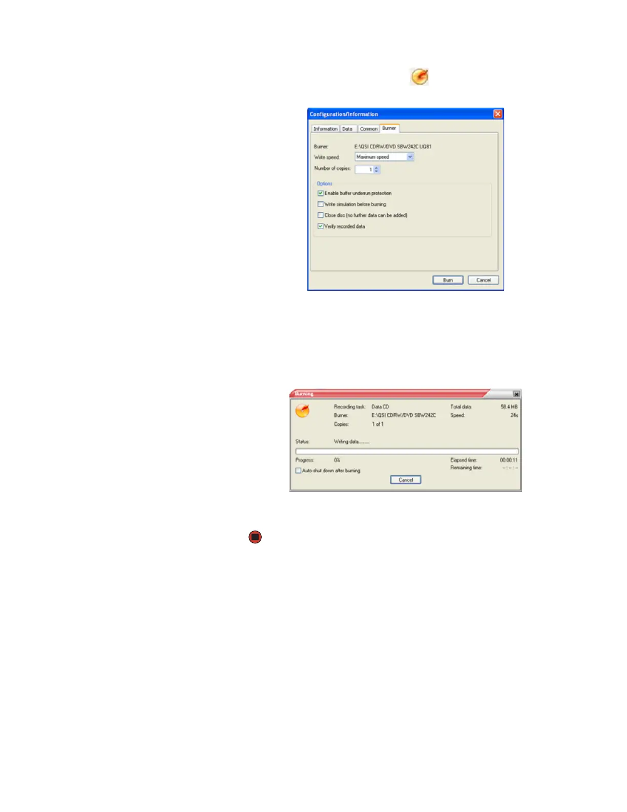 8 If you have one CD burner, click Burn. The Burning dialog box opens and