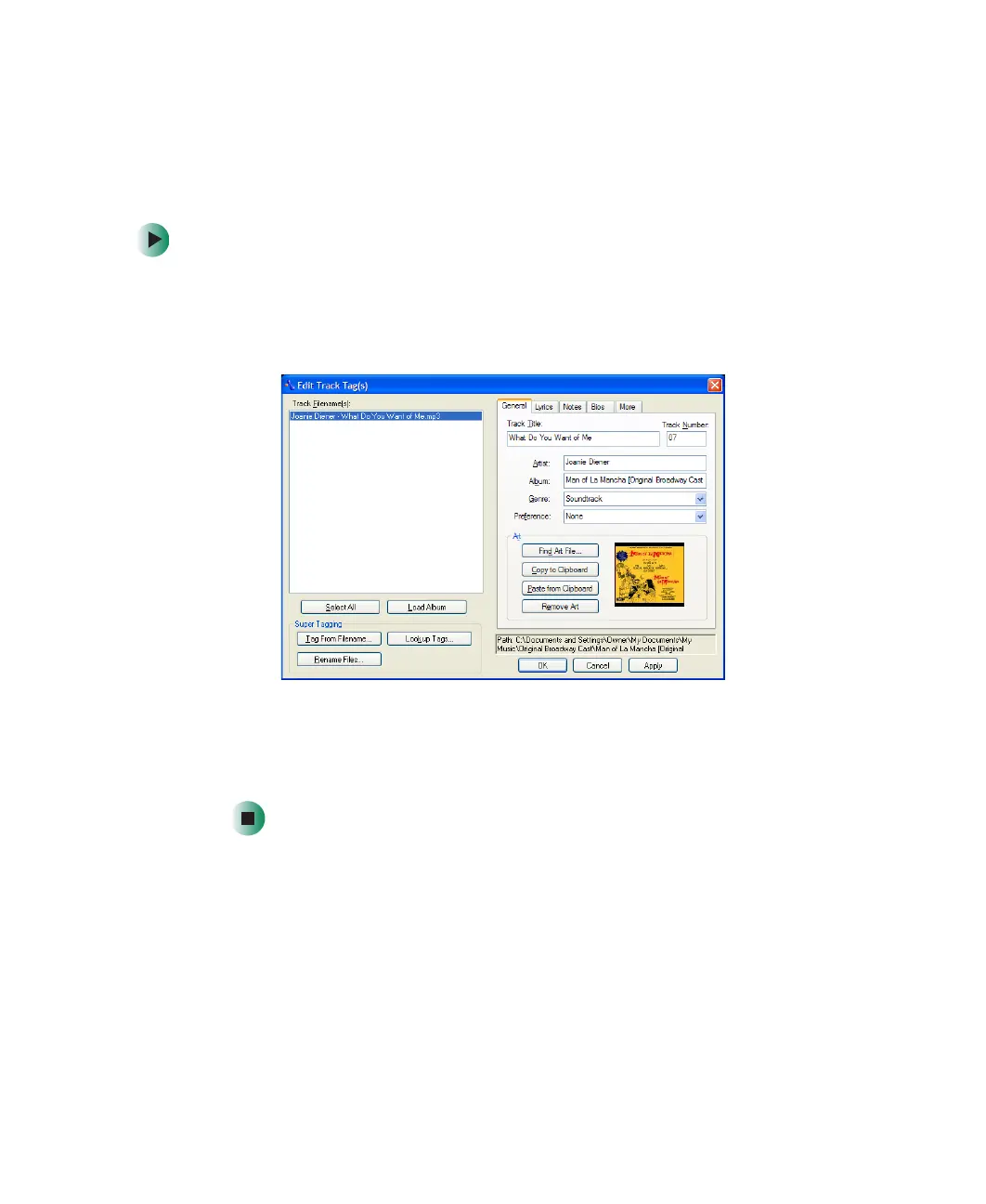 4 Click OK. The new track information appears in the MusicMatch playlist,