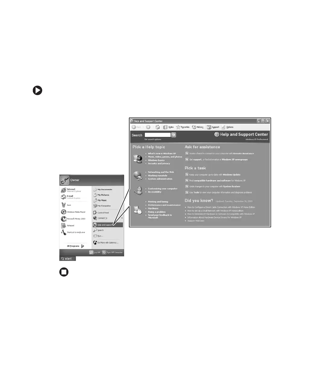 ■ Click Start, then click Help and Support. Help and Support opens.