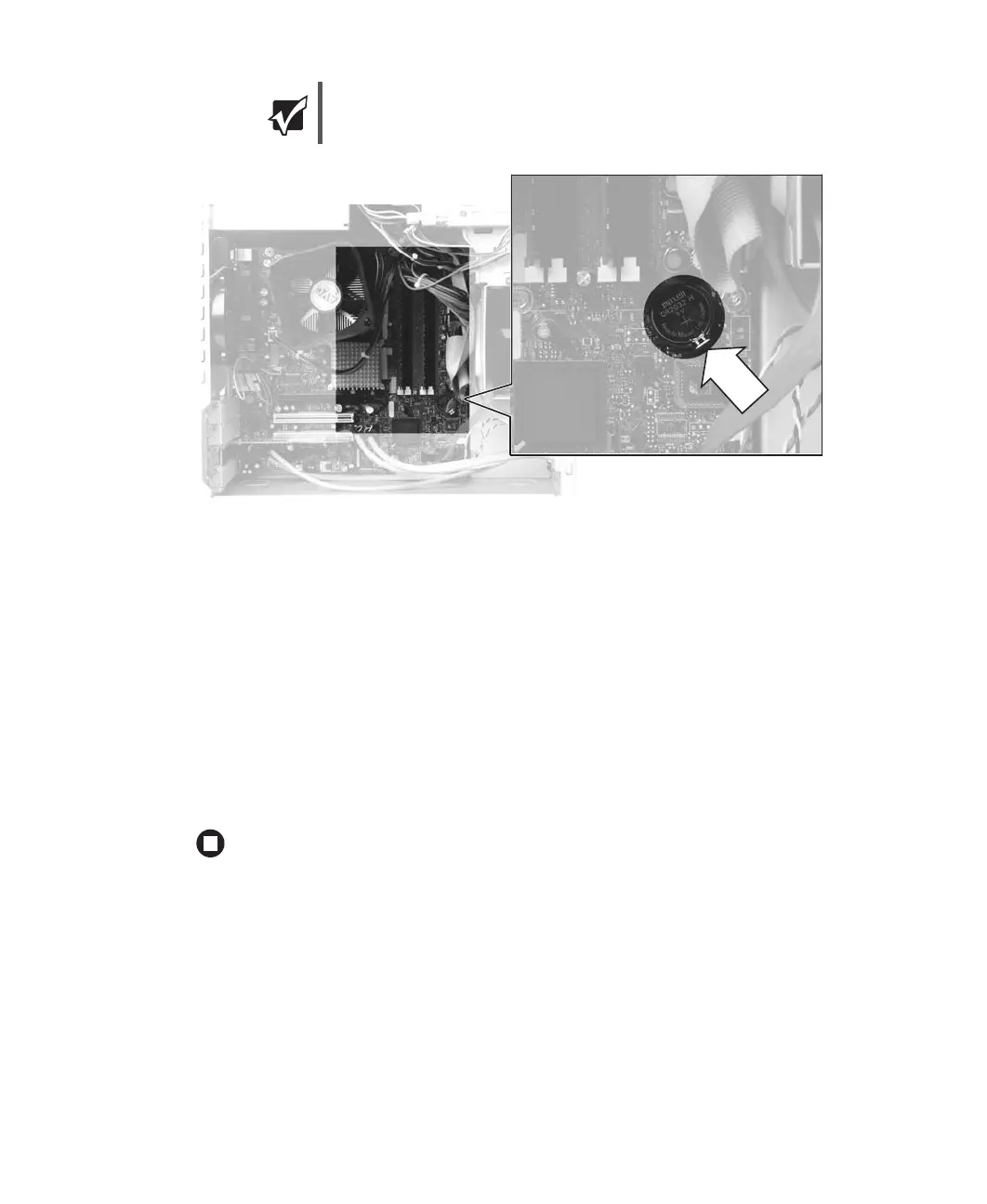 9 Make sure that the positive (+) side of the new battery is facing up, then press the