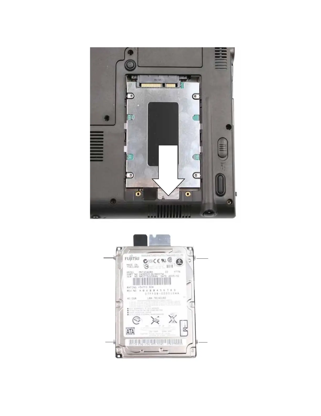 7 Insert the new drive into the bracket, label side up, so the screw holes line up.