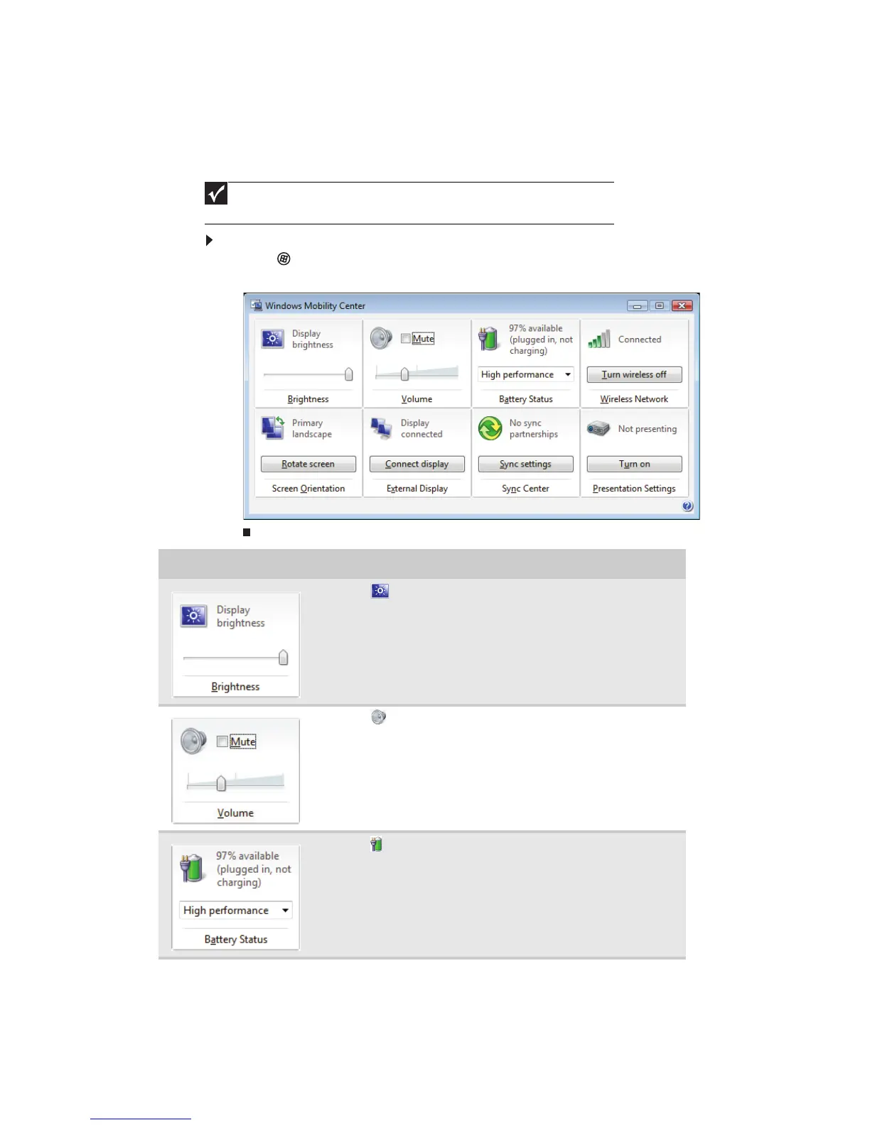 • Click (Start), All Programs, Accessories, then click Windows Mobility Center.