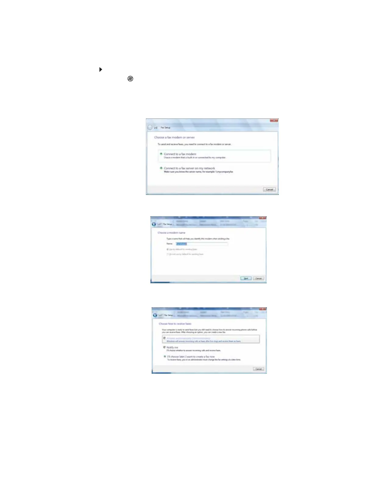 4 Click the type of connection you will be using (fax modem or fax server). The Choose a
