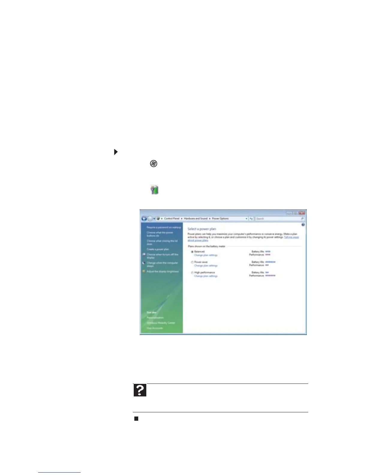 Start, then click Help and Support. Type the keyword power plan