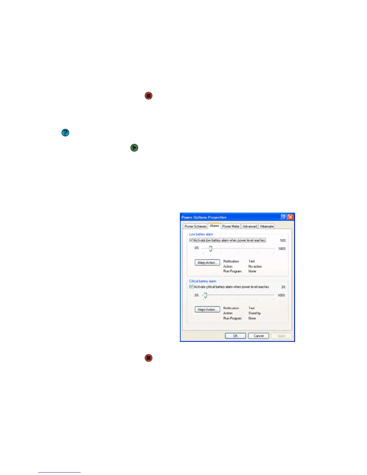 Alarms can alert you when the battery charge is low.