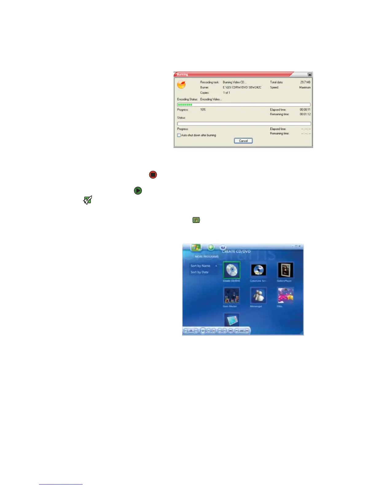 The Burning dialog box opens and Power2Go burns the files to the CD or