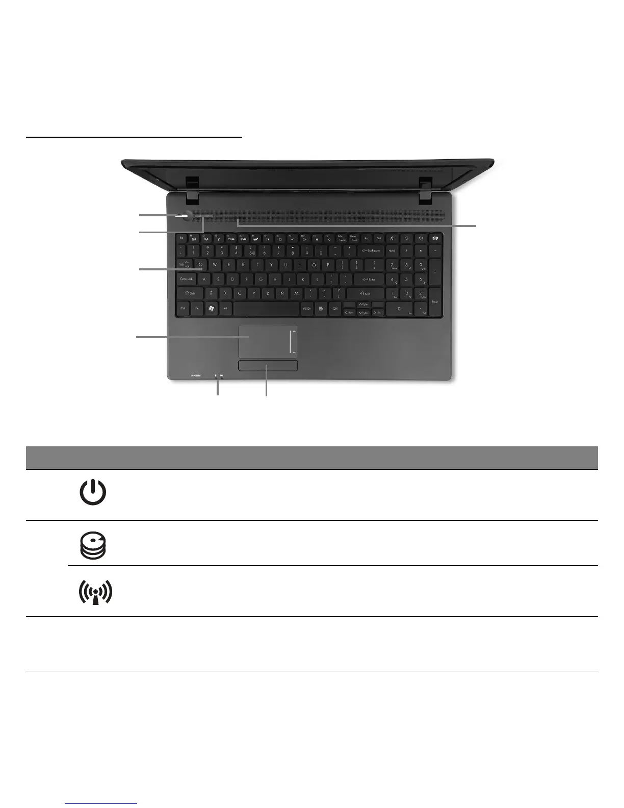 Turns the computer on and off. Indicates the