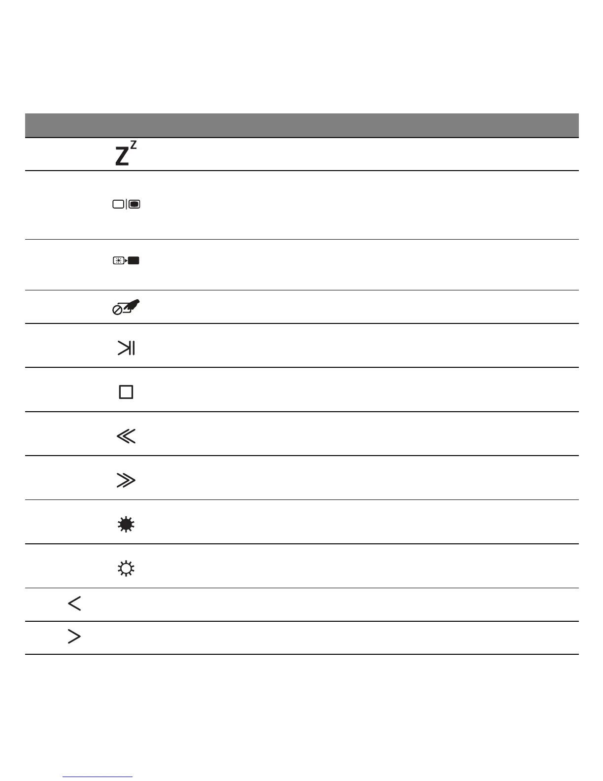 Fn + F11 Brightness down Decreases the screen brightness.