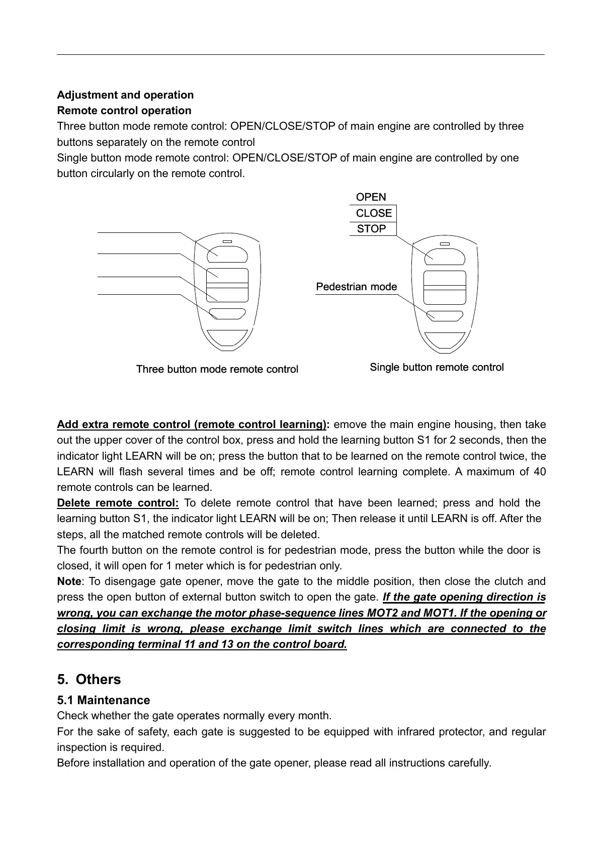 Three button mode remote control: OPEN/CLOSE/STOP of main engine are controlled by three