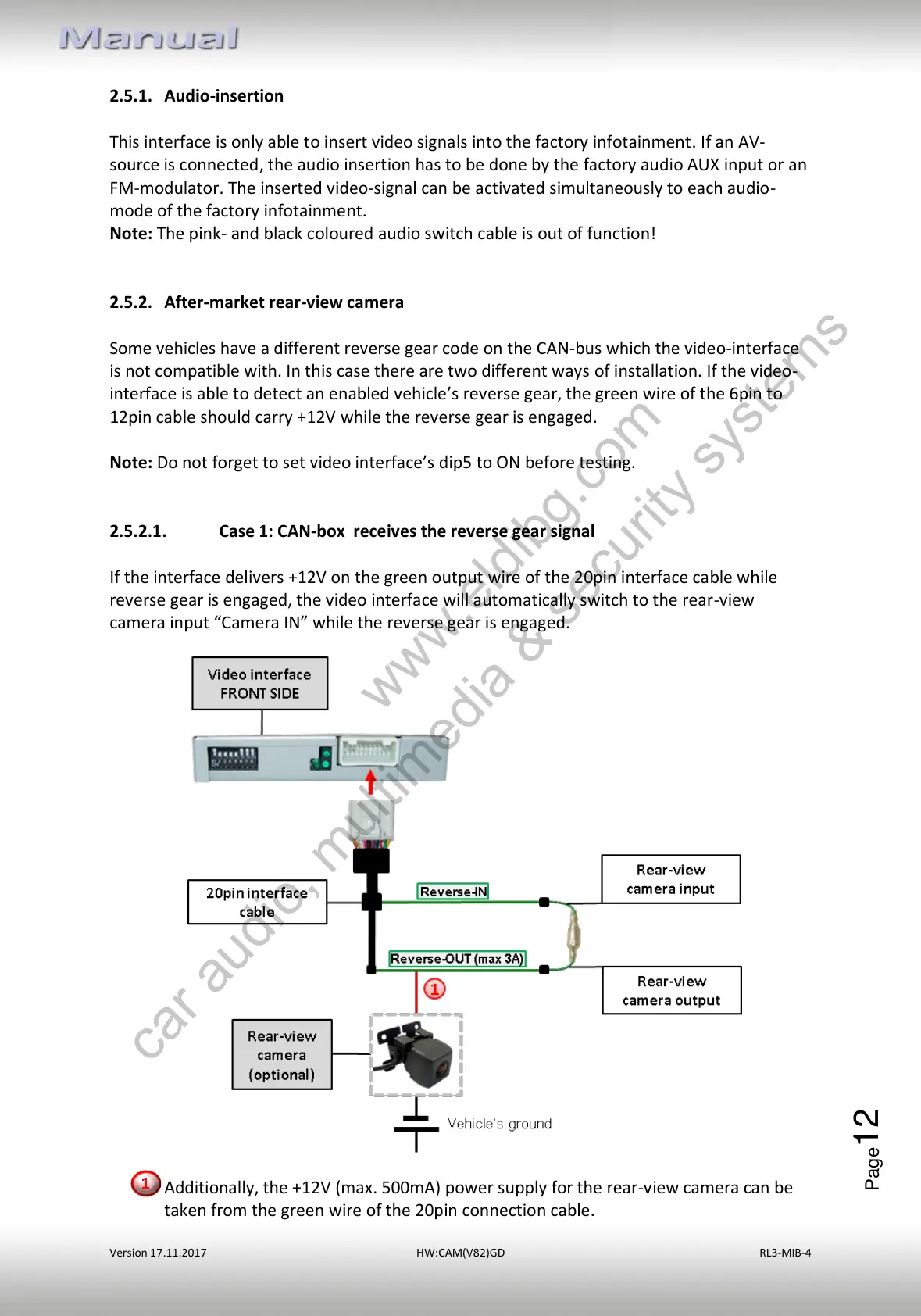 Additionally, the +12V (max. 500mA) power supply for the rear-view camera can be