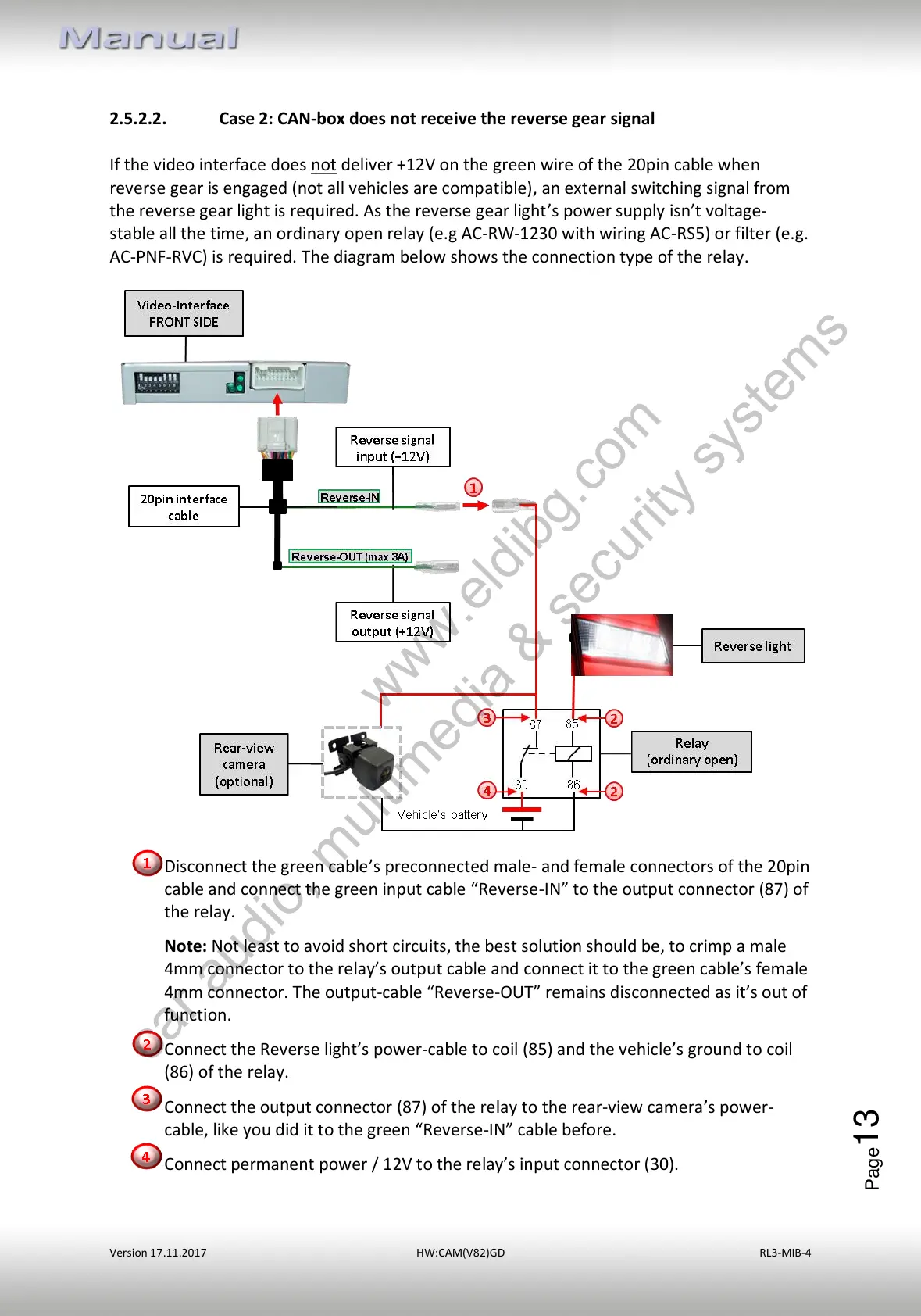 Connect the Reverse light’s power-cable to coil (85) and the vehicle’s ground to coil