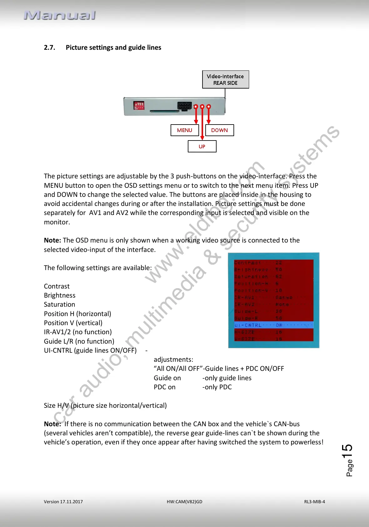 The picture settings are adjustable by the 3 push-buttons on the video-interface. Press the