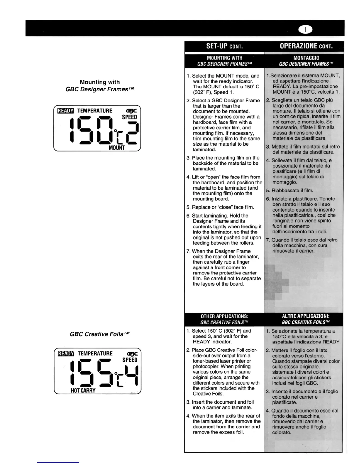 GBC 4500 - Set-Up (Continued); Mounting with Designer Frames Setup; Creative Foils Application Setup