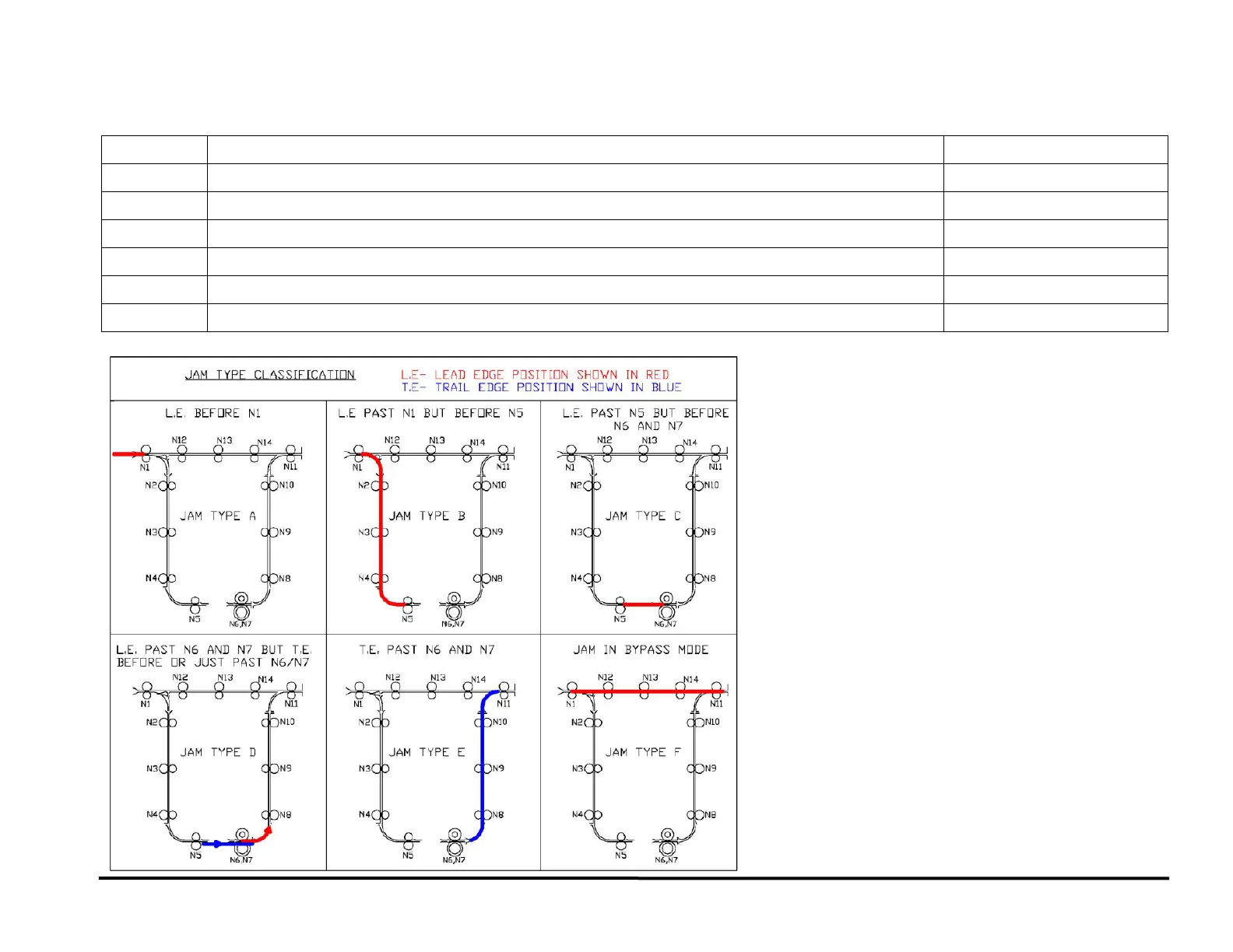 The following table lists each paper jam type. It lists Jam Type (A, B, C, etc.) and the corresponding description (position of first jammed sheet).