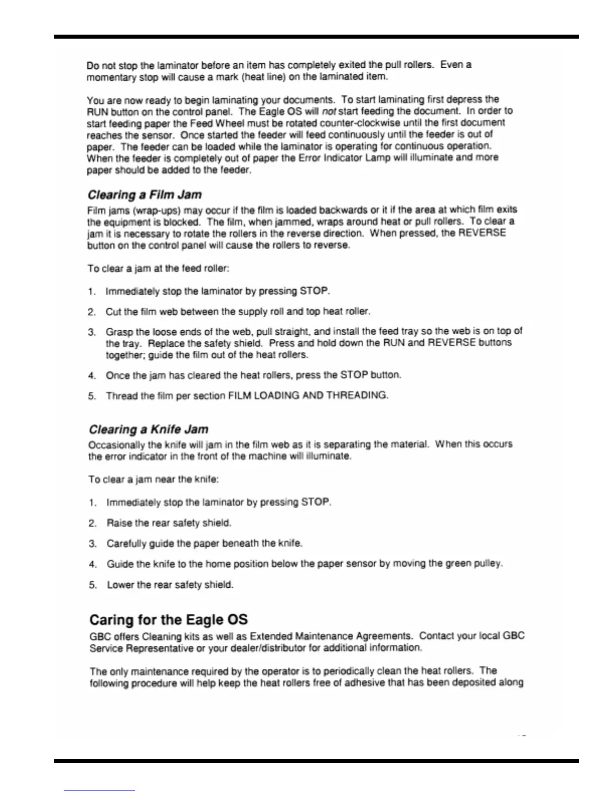 GBC EAGLE 35 OS - Clearing a Film Jam; Clearing a Knife Jam; Cleaning the Heat Rollers