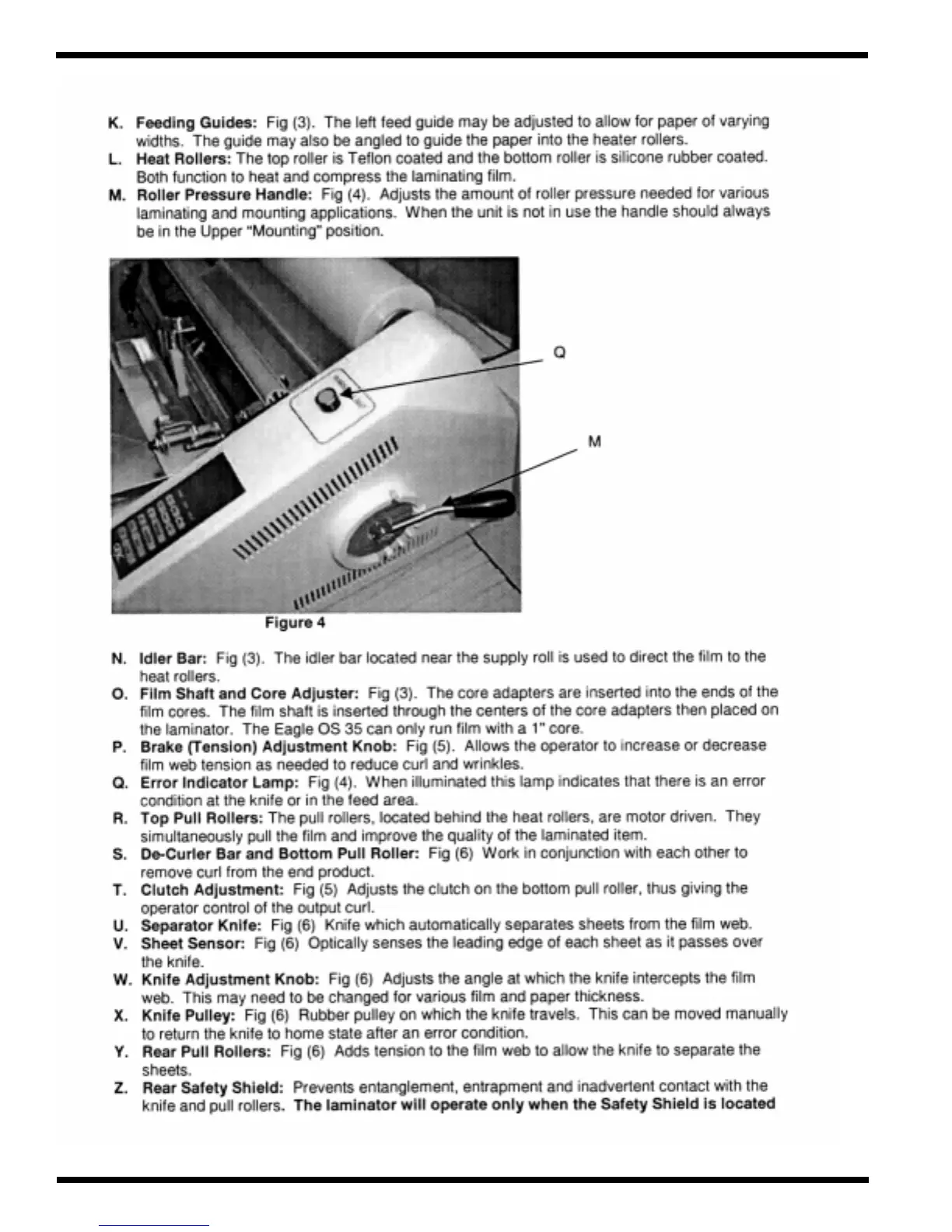GBC EAGLE 35 OS - Heat Rollers; Roller Pressure Handle; Brake (Tension) Adjustment Knob; De-Curler Bar and Bottom Pull Roller