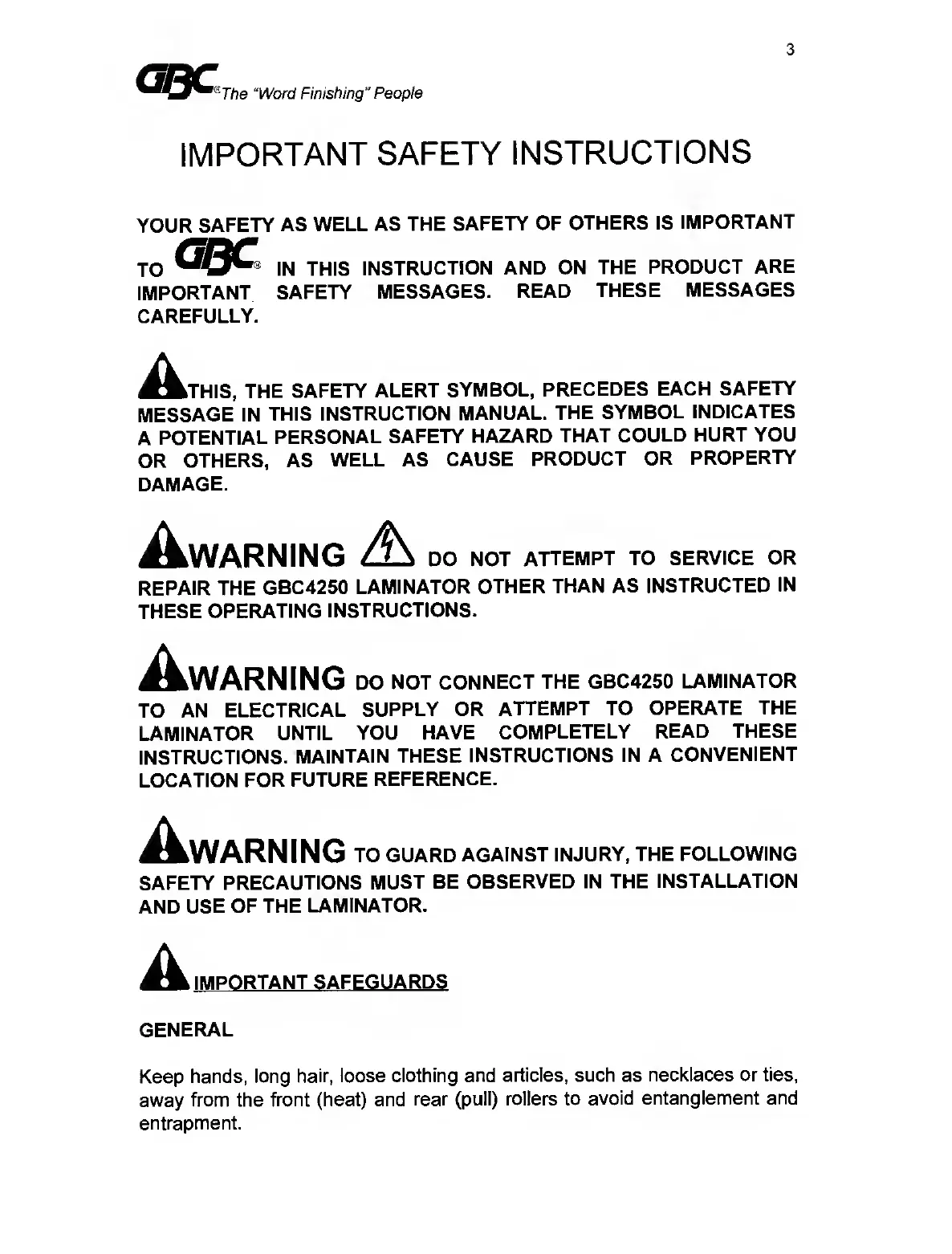 GBC GBC4250 - Important Safety Instructions; Important Safeguards