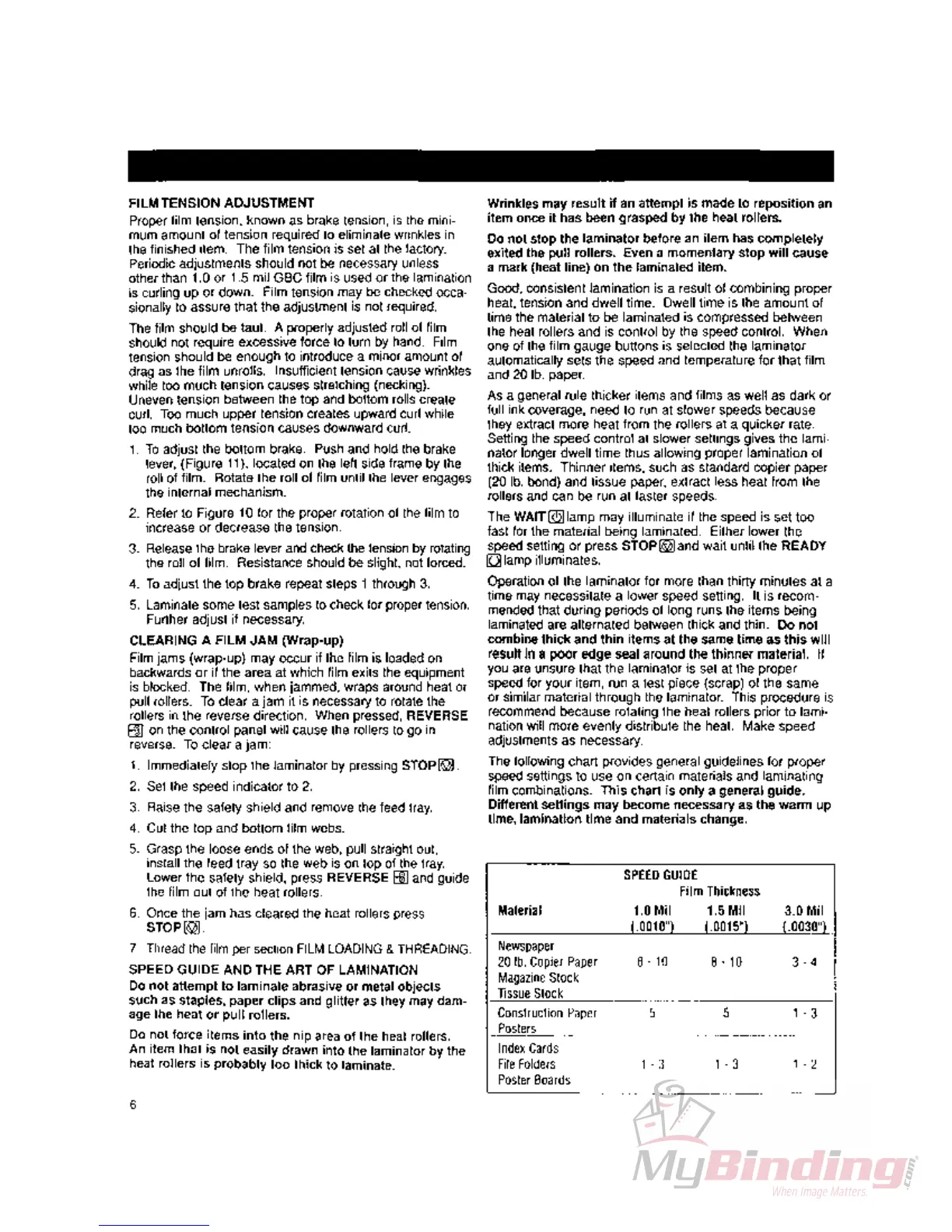 GBC Ultima 65 Roll - Film Tension Adjustment; Clearing Film Jams; Speed Guide and Lamination Tips