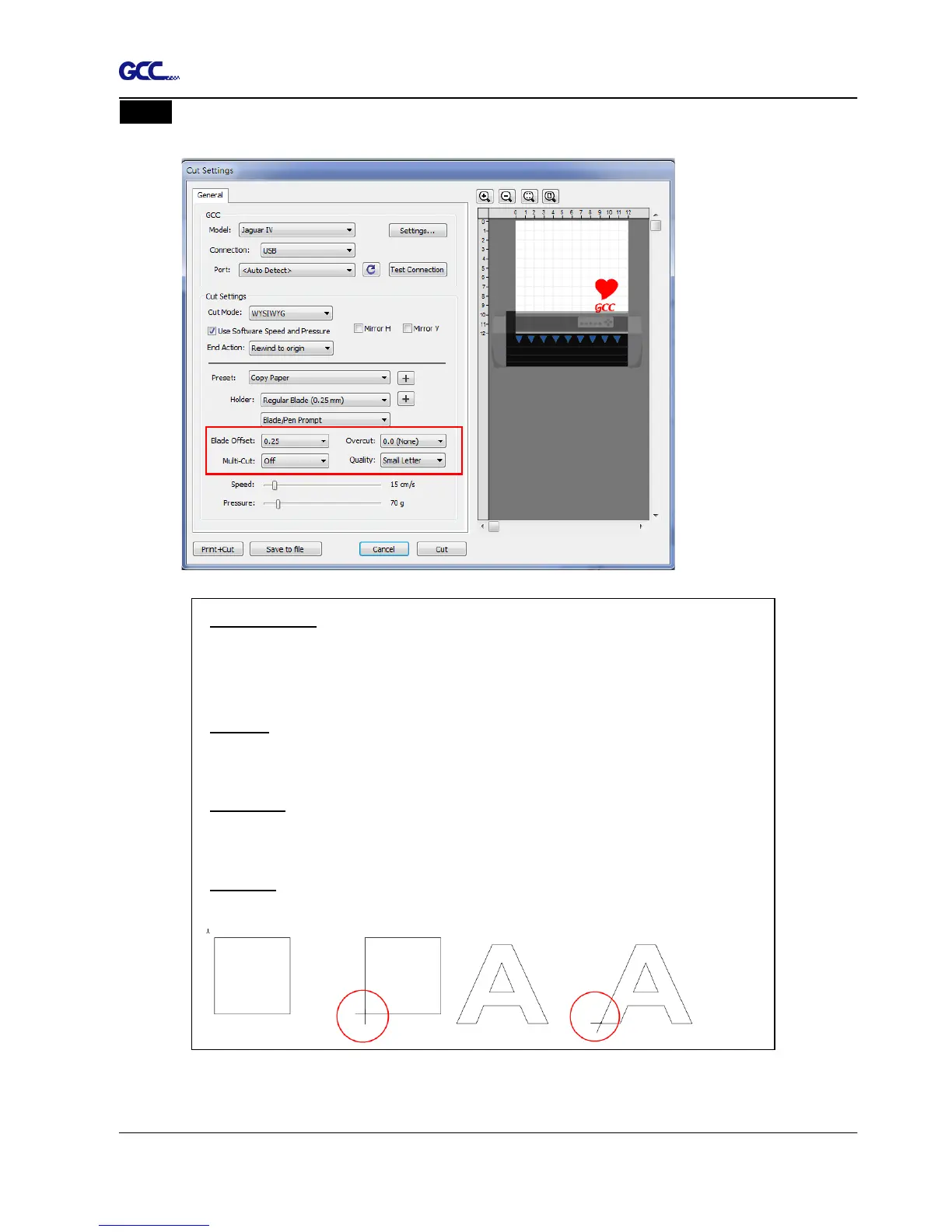 Step 4 Adjust Blade Offset, Overcut Value, Multi-Cut and Quality under Cut Settings window
