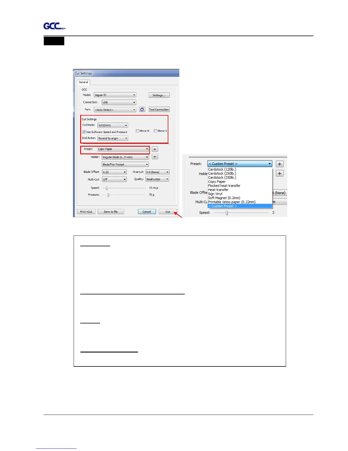 parameters, click on “Cut” to send the data to the GCC cutter and the GCC cutter will