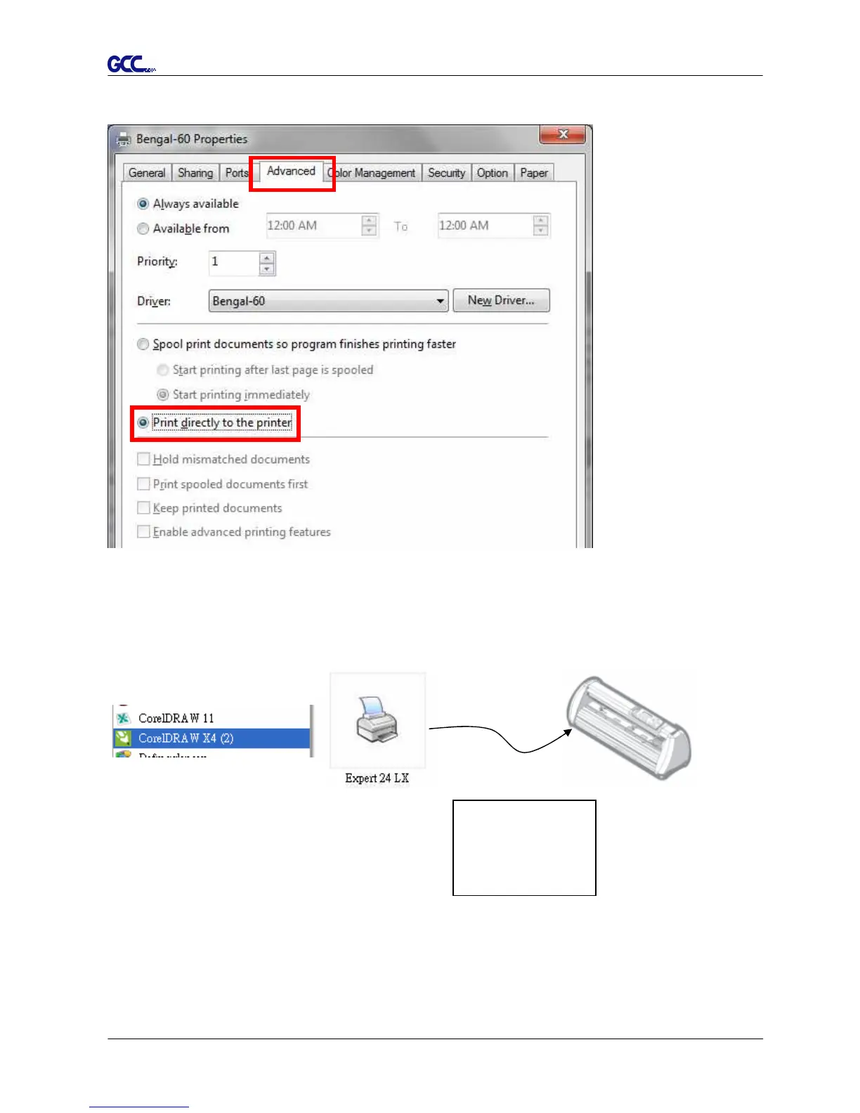 Click “Advanced” tab, then choose “Print directly to the printer” option.