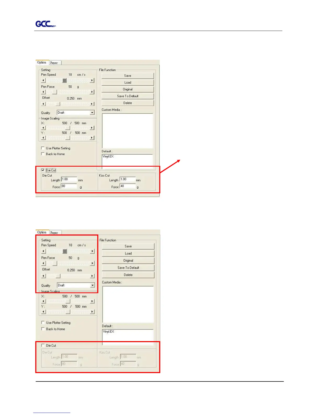 To activate the Die Cut function, go to “Option”, tick “Die Cut”, and enter the amount you wish