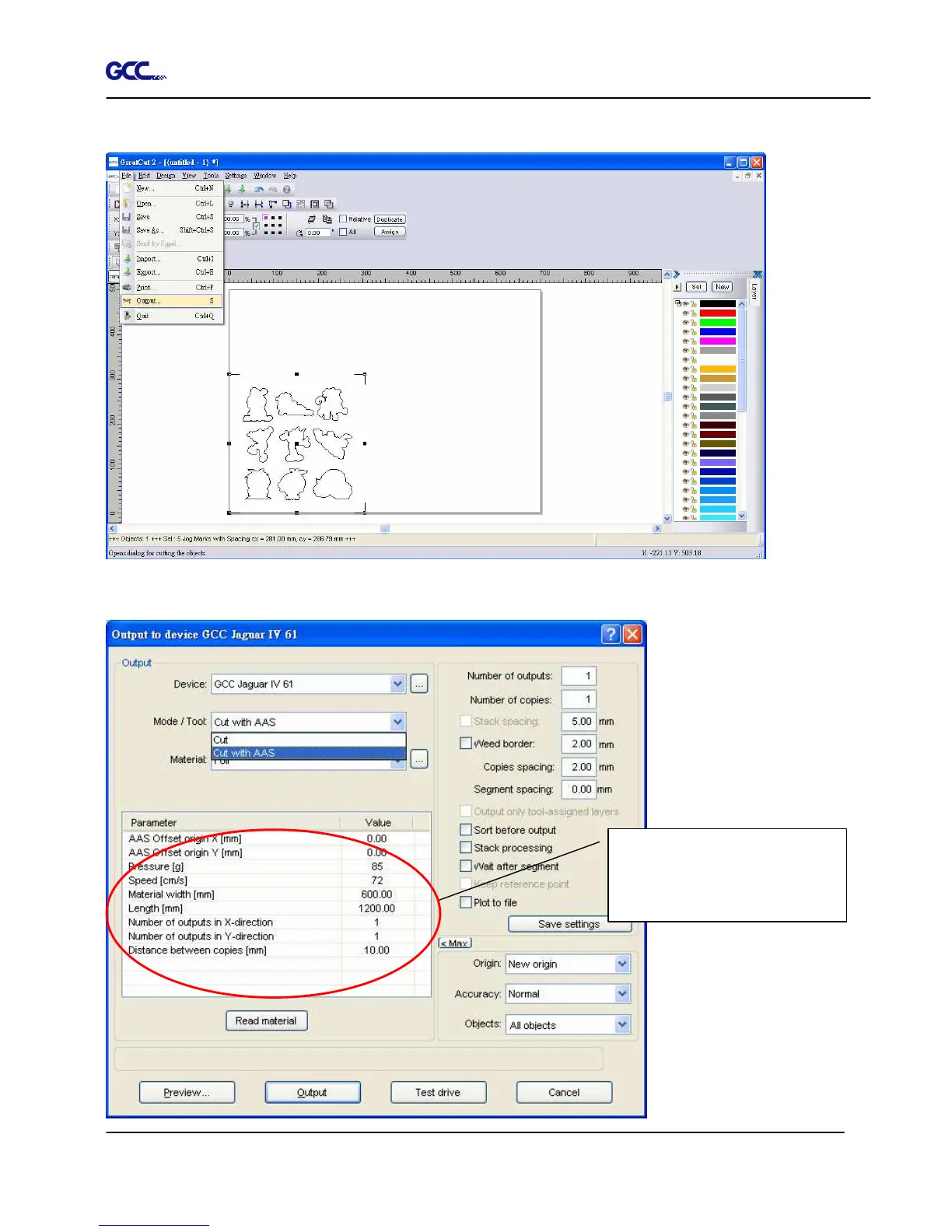 Step 4. Select Cut with AAS in Mode/Tool in the Output to device window.