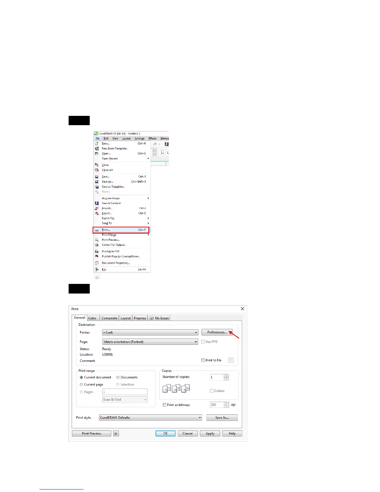 Step 2 Select Printer as i-Craft and click on Preferences…” to set cutting