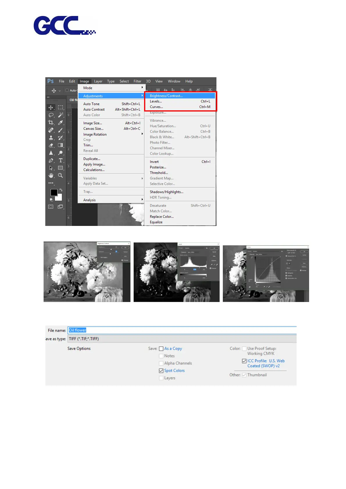 Note: The Brightness/Contrast, Levels, Curves value determines the raised printing effect.