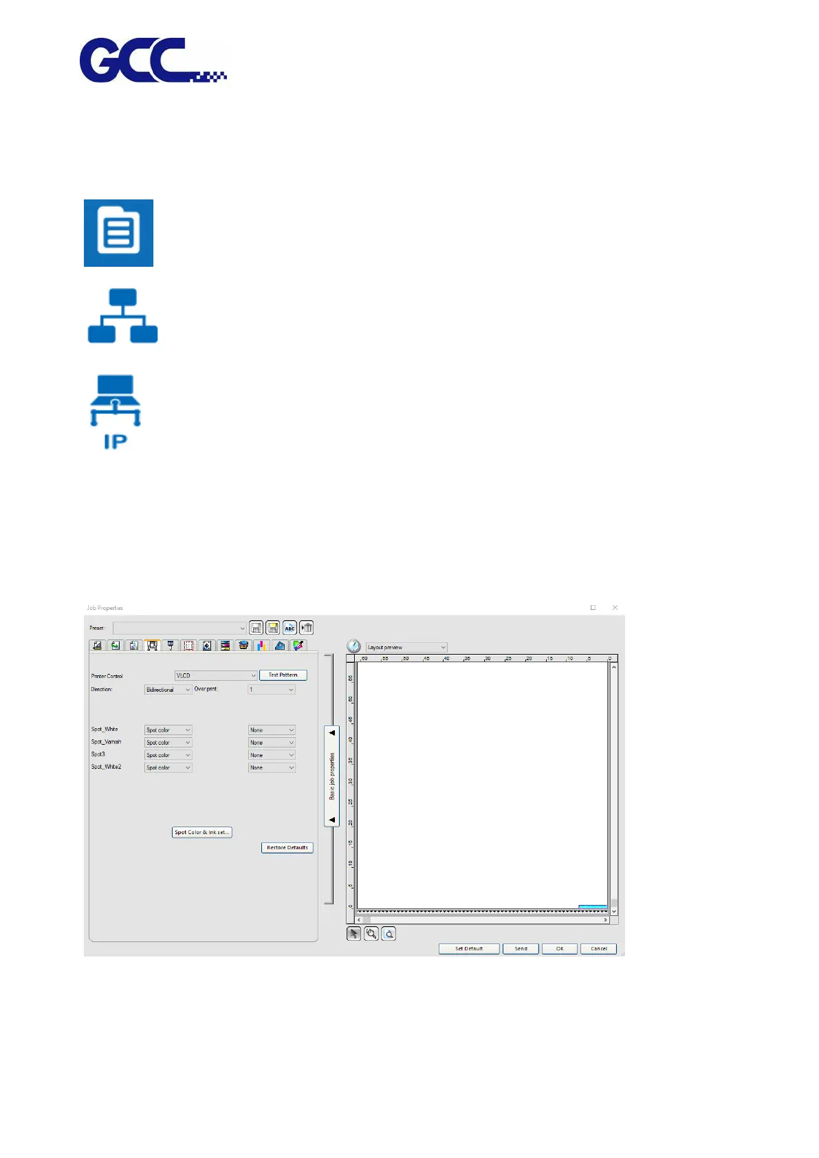 Step 3 Go to Job Properties in FlexiPRINT Select VLCD in Printer Control and click Test Pattern.