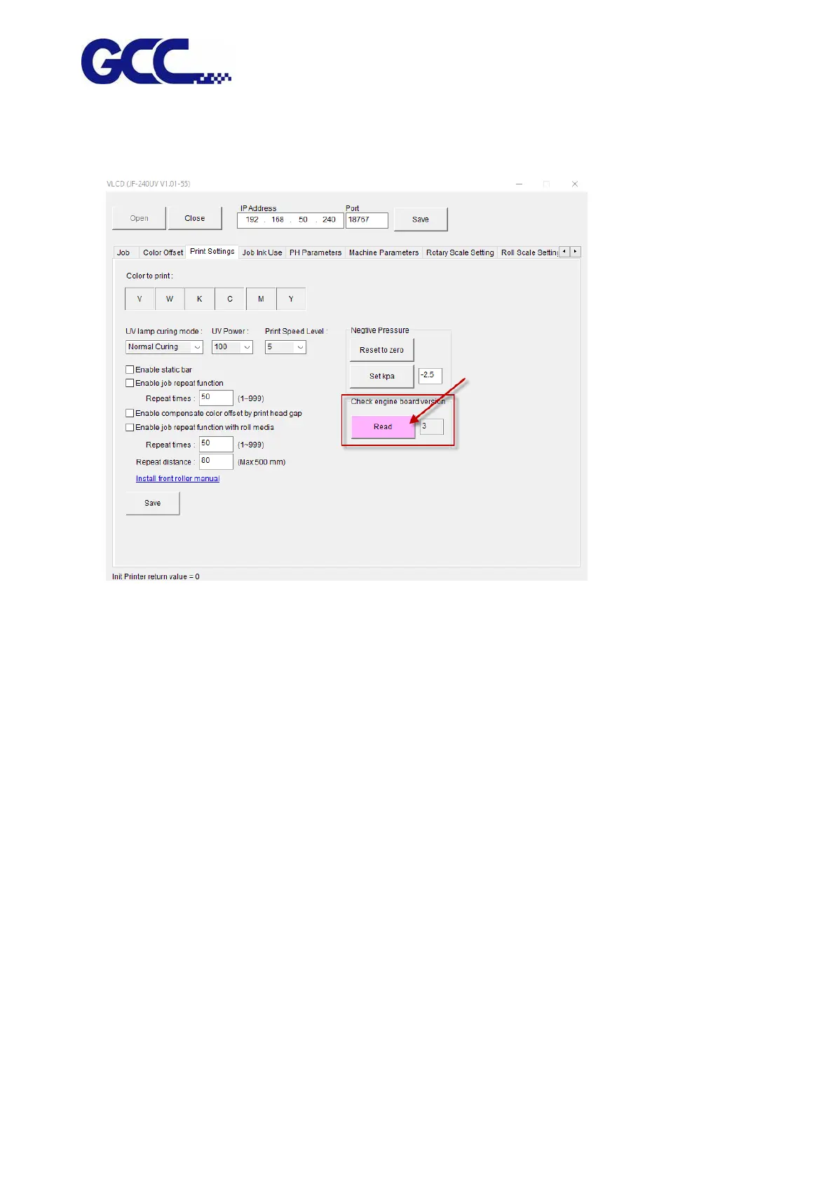 Step 2 Go to Print settingsCheck engine board version and click Read to complete VLCD version