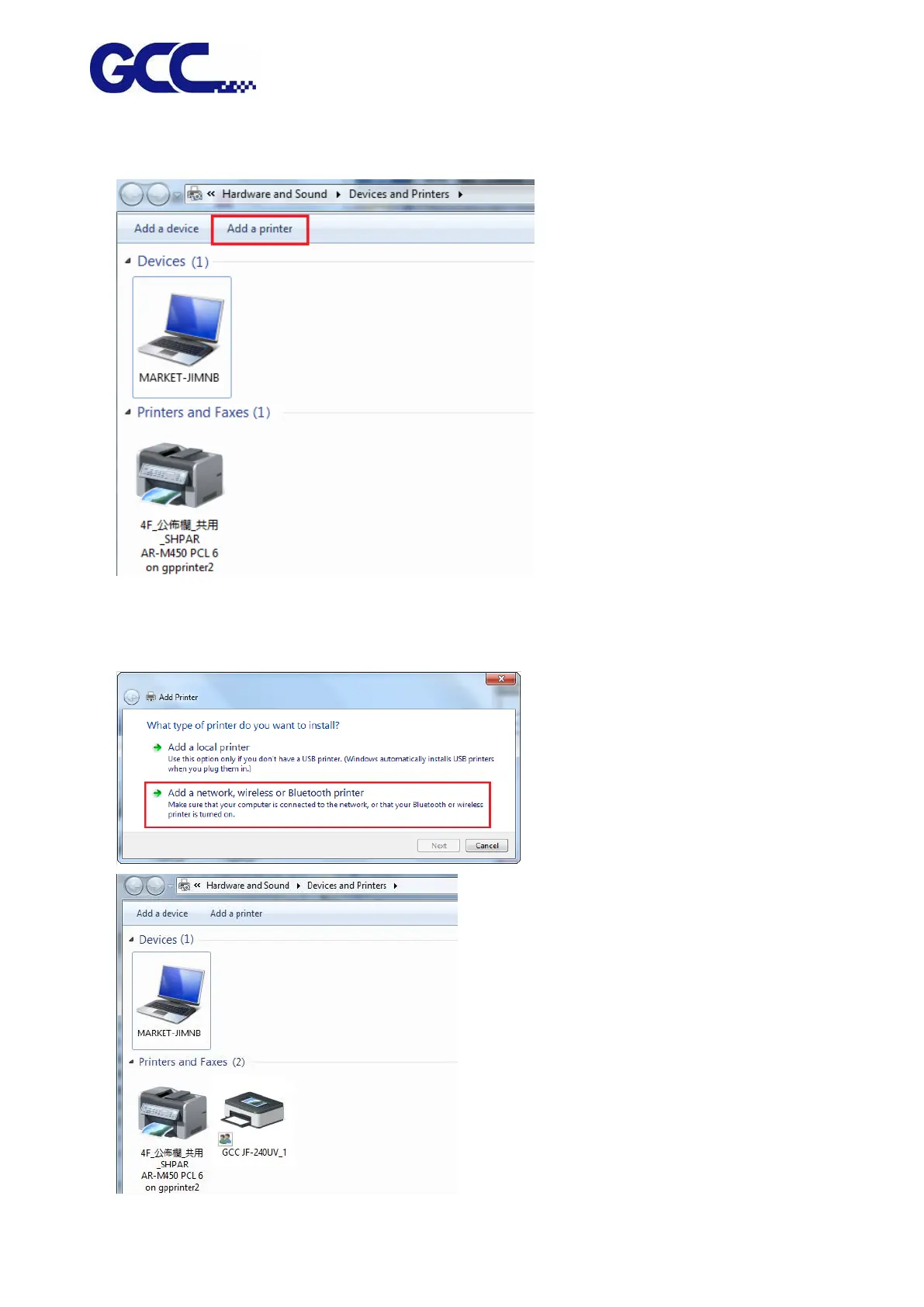 5. Select Add a Network, wireless or Bluetooth printer and choose JF-240UV from the printer list.