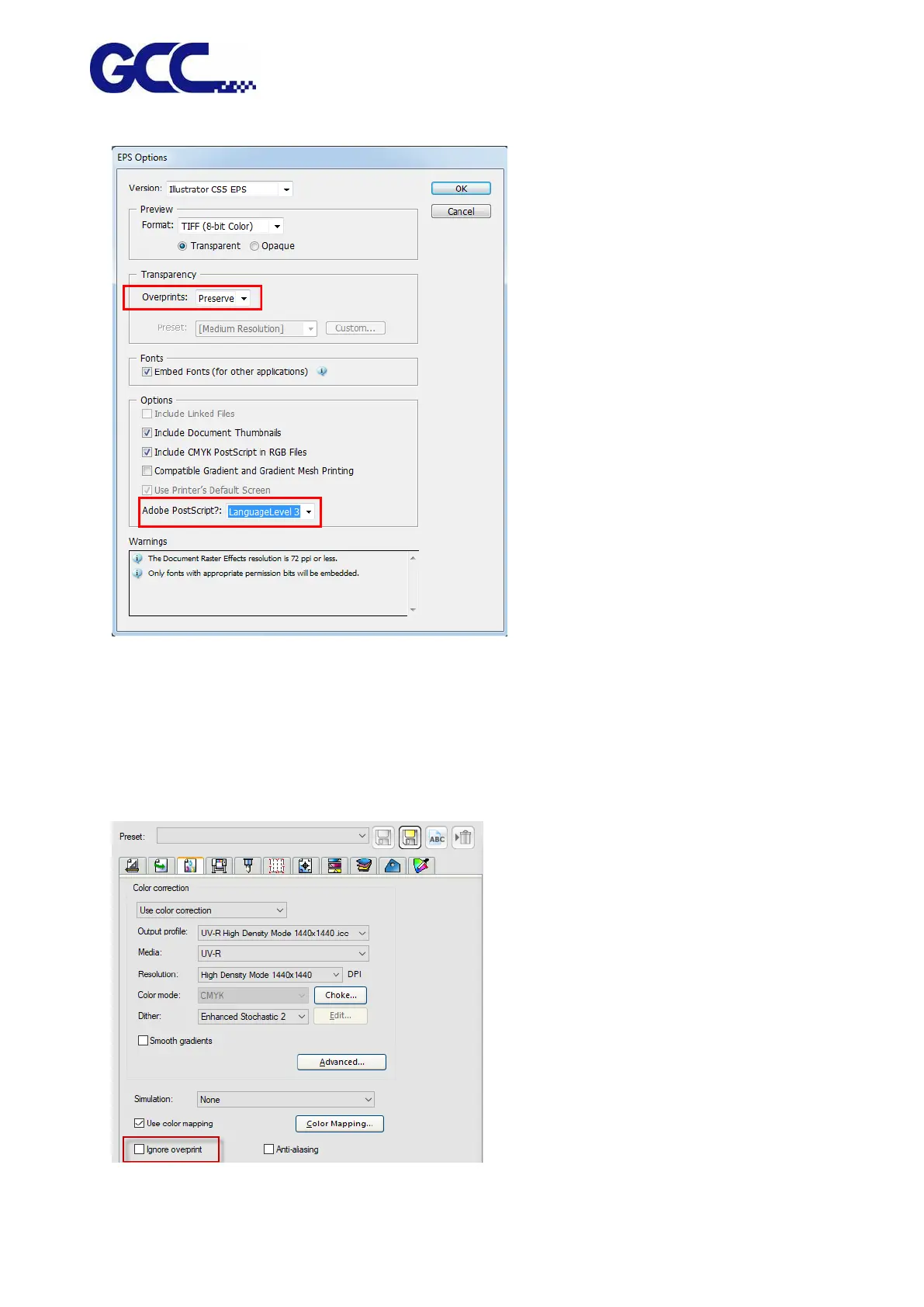 Tips: Preserve the overprints Select the PostScrip Level 3