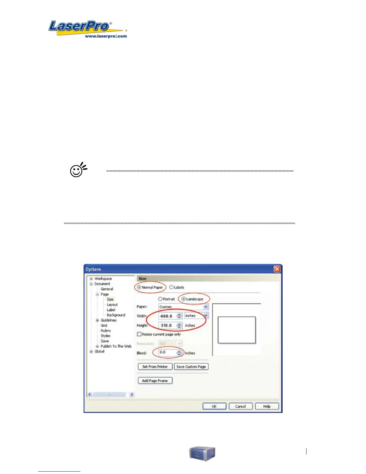 will automatically set the proper orientation and dimensions based on LaserPro