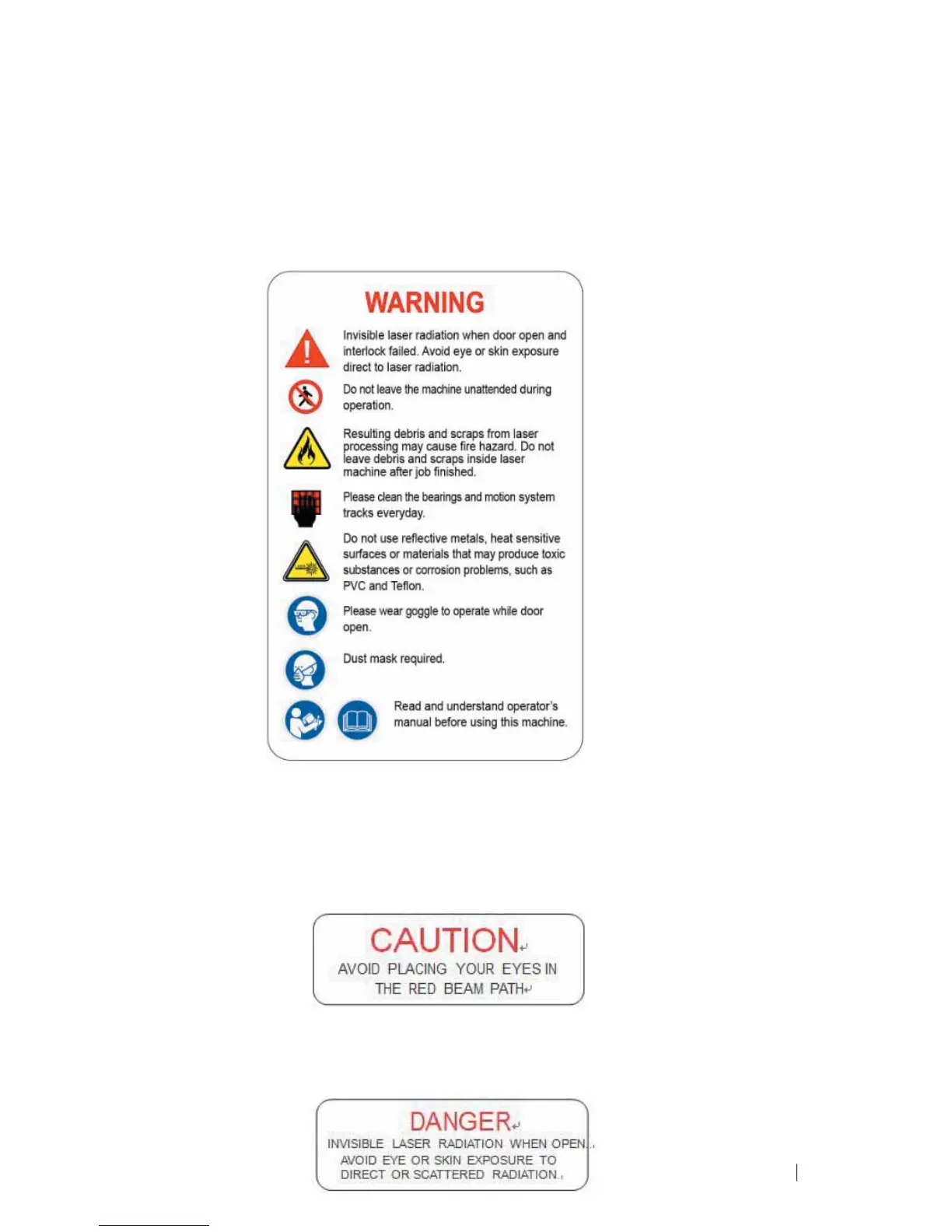 LaserPro machines are very safe under normal use. Furthermore, Laser Path Warning Labels are displayed