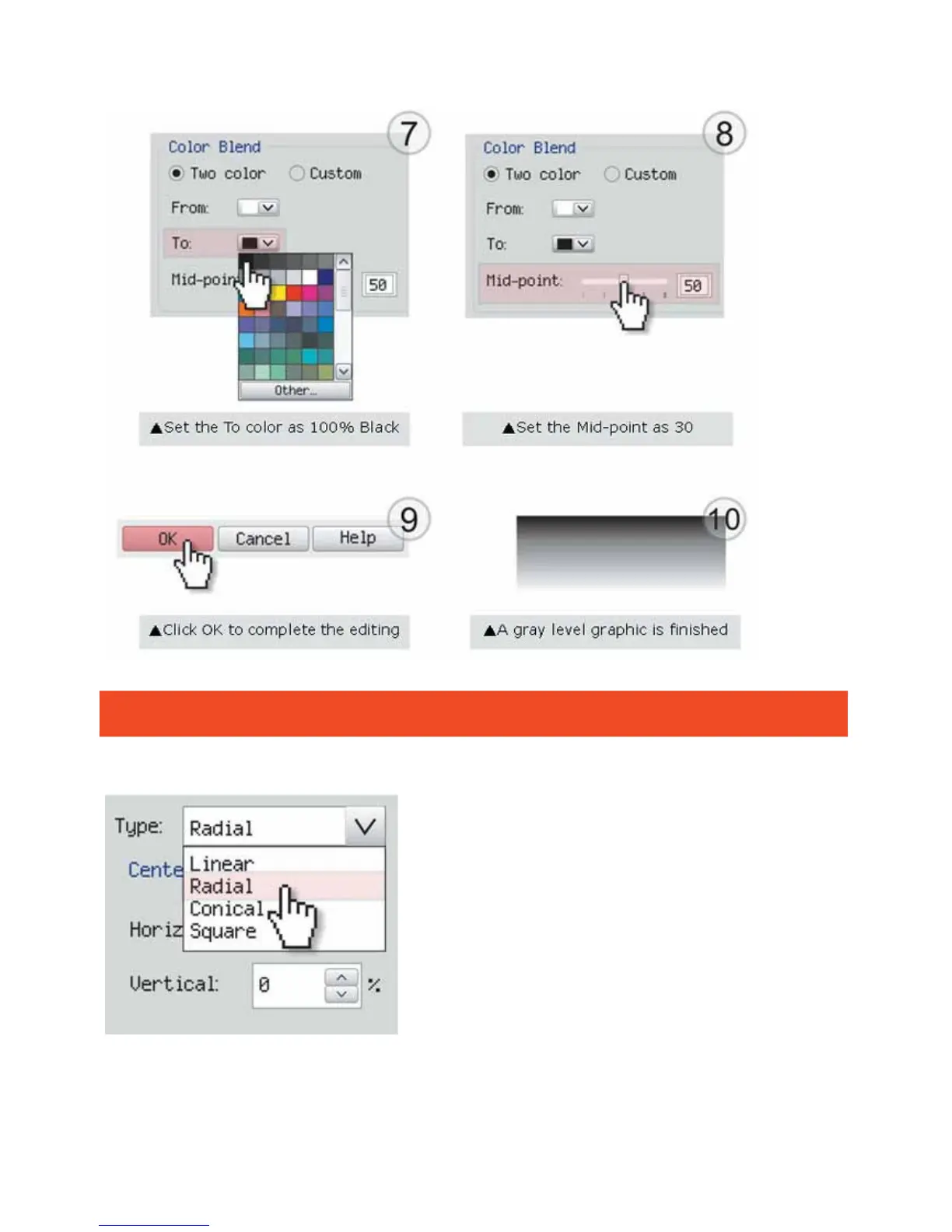 If you need to produce circular 3D graphics, you only need to select Radial as the gray level type in the pull-down
