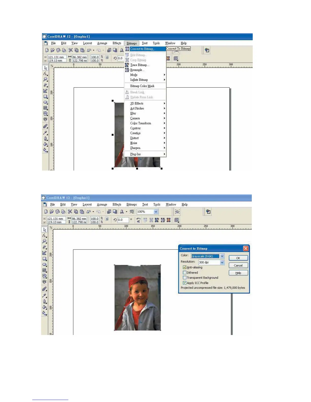 6. Change the Bitmap settings by setting “Color” to Grayscale (8-bit) and “Resolution” to 300 dpi and