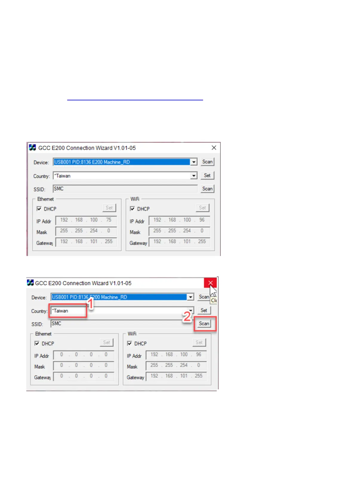 3) Open GCC E200 Connection Wizard and click “Scan”, Device “E200” will be de detected automatically