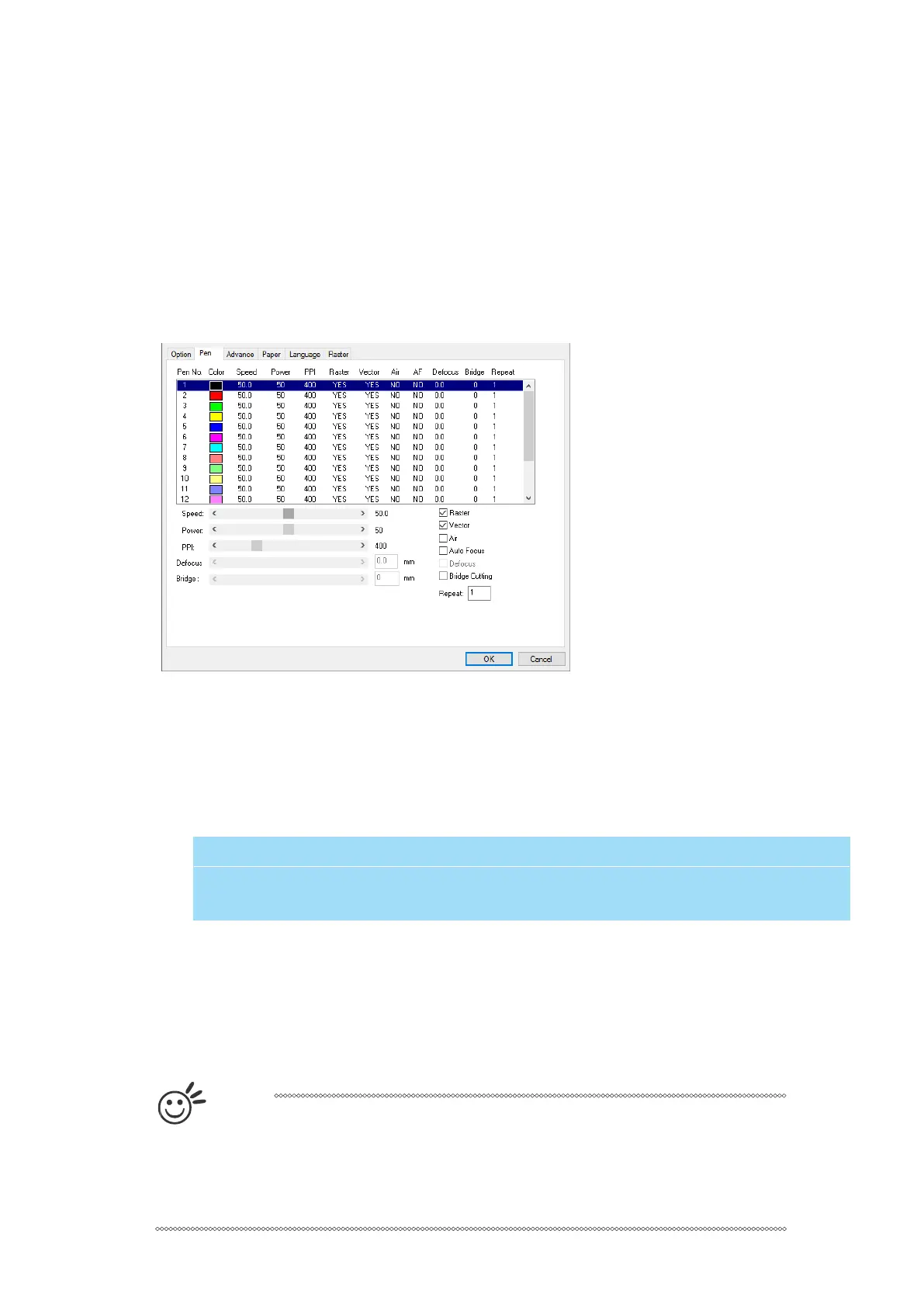 each particular color. In order to utilize up to 16 different pens (laser parameter settings), make