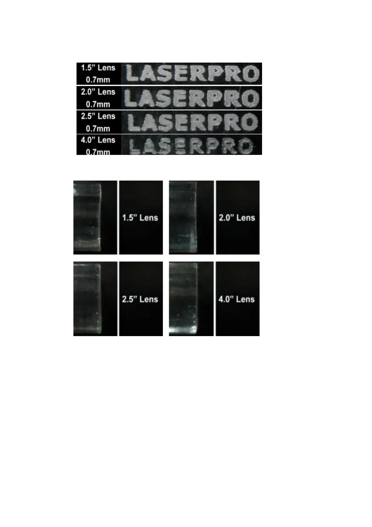 Engraving effects achieved with the different lenses