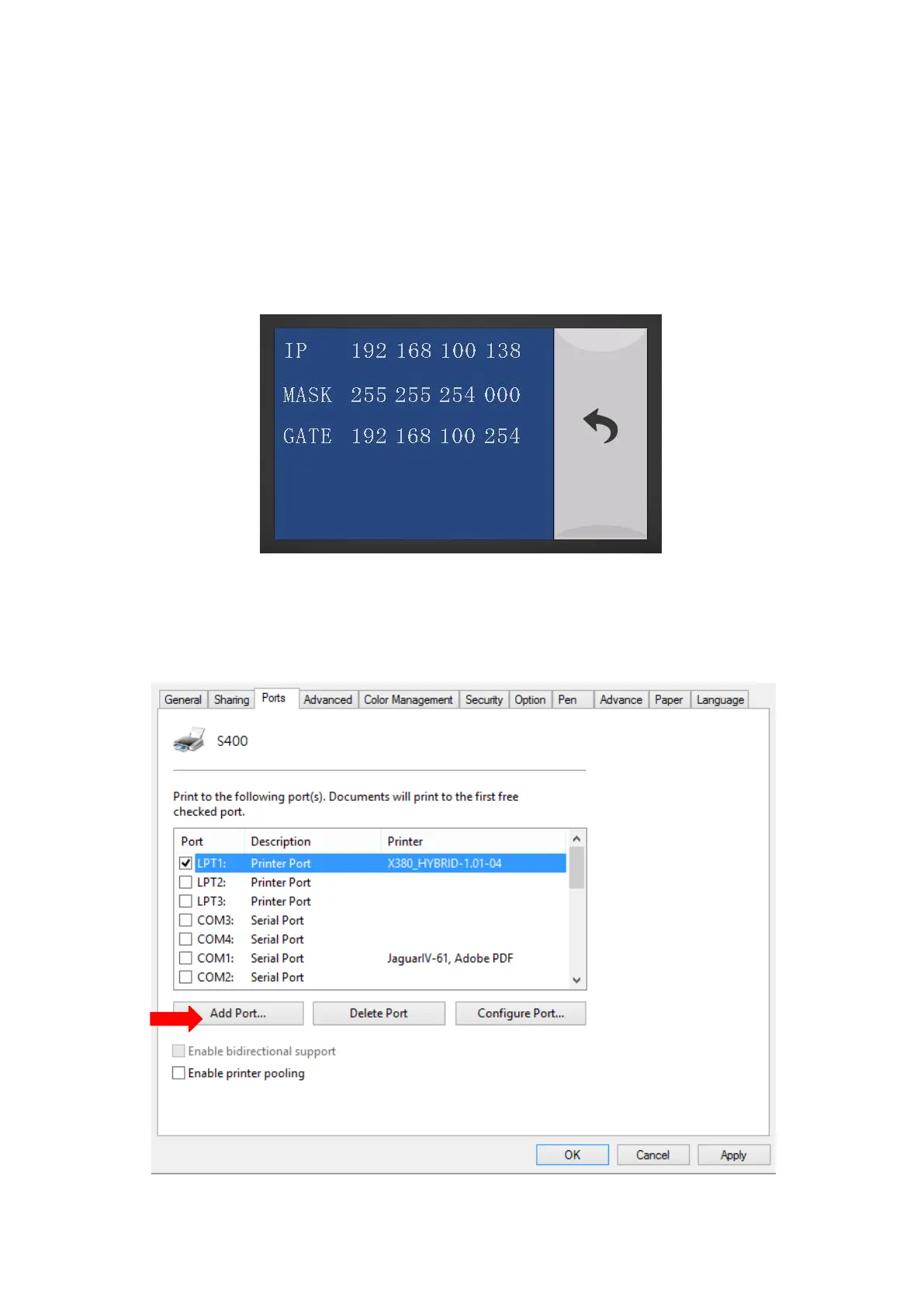 Step 4. Go to <Ports> tab of S400 printer properties, and select <Add Port>, and follow the instruction
