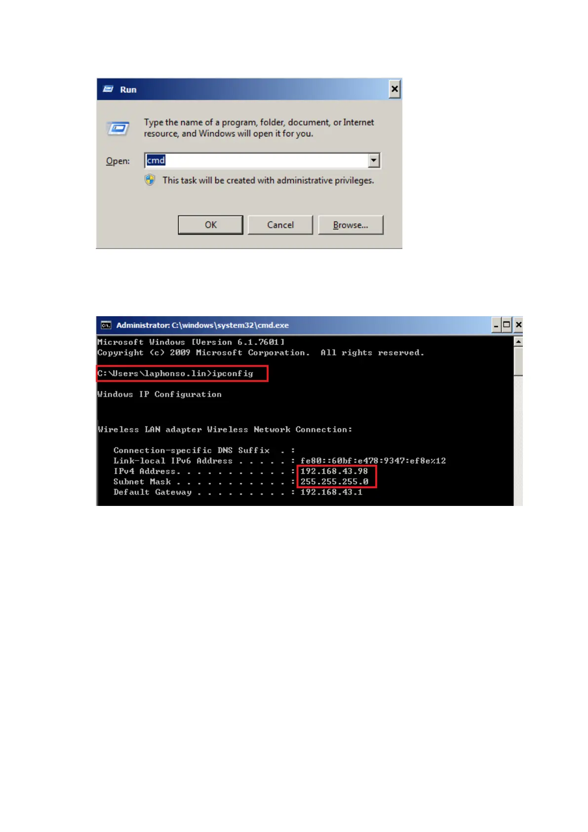 Type “ipconfig” after the prompt symbol then press enter, the TCP/IP configurations of this