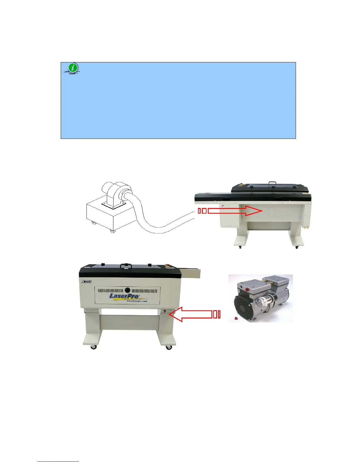 Connect the fume ventilation system and air compressor to the laser system before starting laser